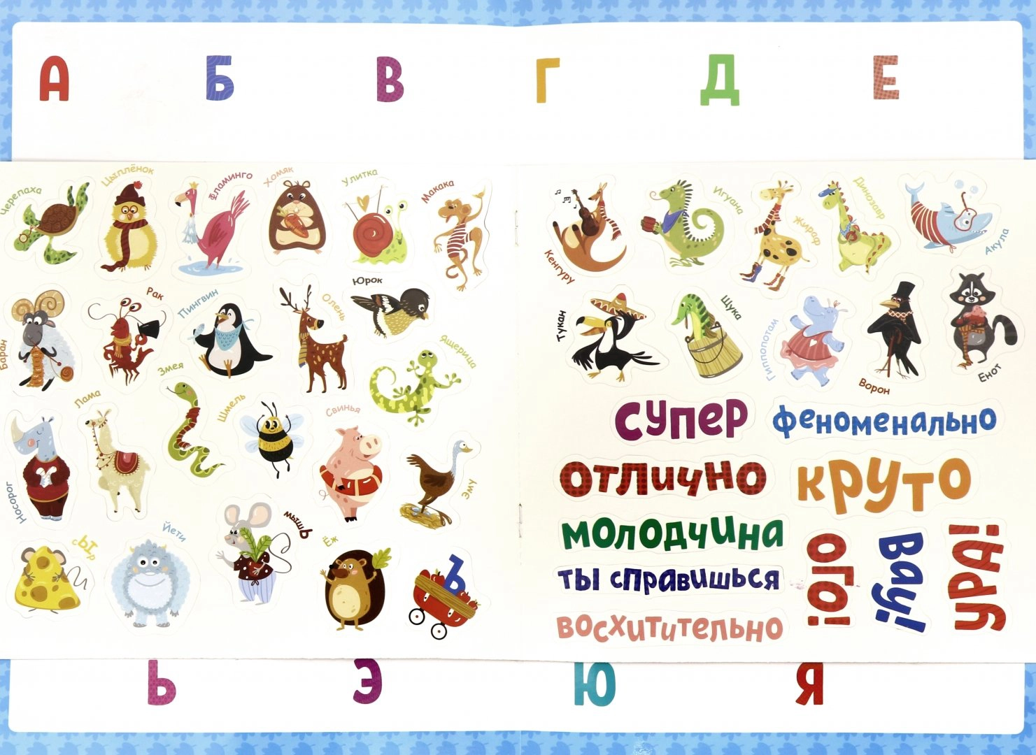 Привет, друг! Это твой СУПЕРплакат "Алфавит". А знаешь, что должно быть в СУПЕРплакате? Правильно! Супернаклейки! Посмотри, какие весёлые и яркие персонажи. Приклей каждого возле своей буквы.