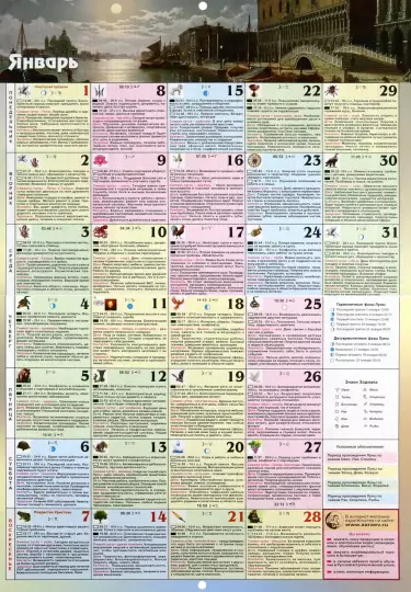 Takzhe opisyvajutsja osobennosti sezonno-klimaticheskikh vlijanij i solnechno-lunnye ritmy v techenie godovogo tsikla. Kalendar pomozhet mnogim ljudjam, i v osobennosti zhenschinam, legche prognozirovat te ili inye zhiznennye situatsii i vzaimootnoshenija.