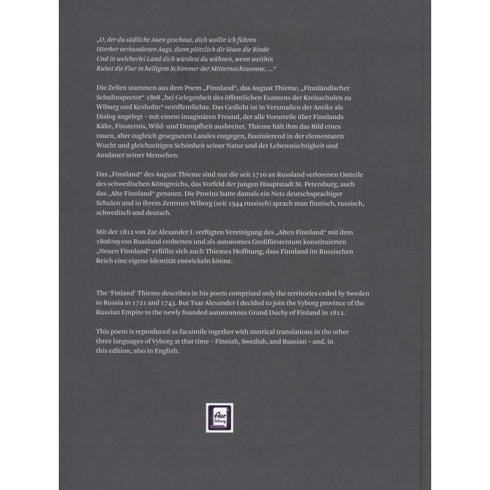 This poem is reproduced as facsimile together with metrical translation in the other three languages of Vyborg at that time - Finnish, Swedish, and Russian - and, in this edition, also in English.