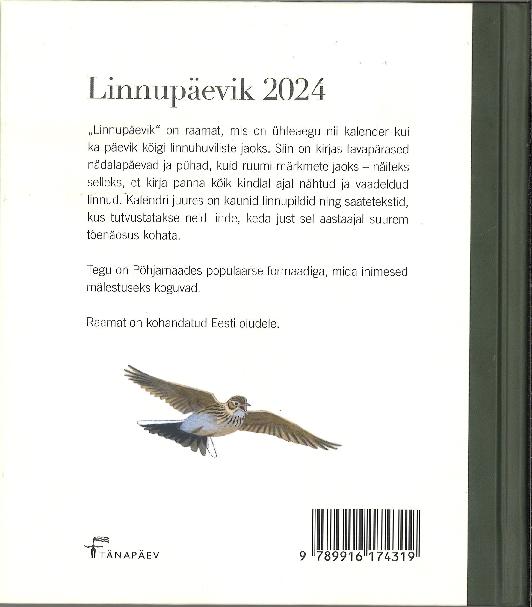 "Linnupäevik" on raamat, mis on ühteaegu nii kalender kui ka päevik kõigi linnuhuviliste jaoks. Siin on kirjas tavapärased nädalapäevad ja pühad, kuid ruumi märkmete jaoks - näiteks selleks, et kirja panna kõik kindlal ajal nähtud ja vaadeldud linnud. Kalendri juures on kaunid linnupildid ning saatetekstid, kus tutvustatakse neid linde, keda just sel aastaajal suurem tõenäosus kohata.