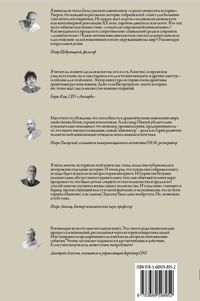I edinstvennoe, chto ikh obedinjaet - to, chto kazhdyj iz nikh vnes svoj vklad v progress chelovechestva, blagodarja chemu zhizn ljudej rjadom s nimi i ikh potomkov - blizkikh i dalekikh, takikh, kak my s vami - stala chem-to luchshe, udobnee, komfortabelnee i tsivilizovannee. Inymi slovami, eto - rasskazy o ljudjakh, o kotorykh blagodarnomu chelovechestvu stoit pomnit. I v zhizni kotorykh stoit iskat primery dlja podrazhanija, na chem opyte udach i oshibok stoit uchitsja, o chikh delakh stoit razmyshljat.