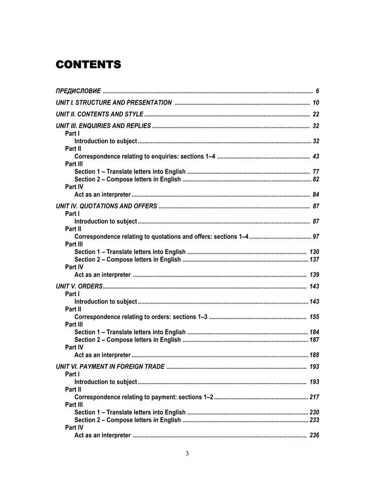 Учебник предназначен для студентов вузов и факультетов, готовящих специалистов во внешнеэкономической деятельности, а также широкого круга лиц, изучающих деловой английский для практического использования в профессиональной деятельности. Он содержит практические уроки и упражнения, которые помогут читателю улучшить свою грамматику, лексику и произношение на английском языке, а также расширить свой словарный запас в профессиональной сфере. Книга содержит темы, связанные с деловых письмами, проведением переговоров, телефонным общением, отчётами и презентациями, а также с другими ситуациями, которые могут встретиться в бизнес-среде. Кроме того, авторы предоставляют современные примеры и образцы наиболее распространённых документов и форм, используемых в данной среде, и дают советы по эффективной коммуникации на английском языке. Цель пособия - формирование и развитие у студентов навыков письменного и устного делового общения, необходимых для осуществления будущих профессиональных обязанностей. Учебник построен по тематическому принципу. Темы отражает основные внешнеэкономические операции. Все тексты, представленные в учебнике, аутентичны и являются образцами современного делового английского языка. В широком наборе писем на английском и русском языках представлены вариантные ситуации основной темы урока с целью дать обучающимся адекватную информацию по изучаемой теме, а преподавателю - обильный материал для закрепления лексики и развития устных навыков. Для облегчения самостоятельной работы студентов все упражнения, включая перевод писем на английский язык, снабжены ключами.