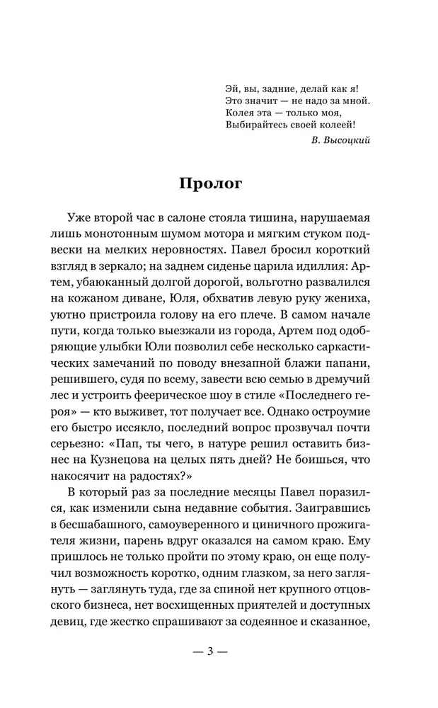 "Роман Евгения Соловьева "Чужая колея" - это жесткий, бескомпромиссно-правдивый рассказ человека, прошедшего через дикую эпоху "первоначального накопления капитала" в 90-е, человека, которому пришлось хоронить друзей и родных, защищать свою семью, держать удары, присылаемые судьбой уже в более спокойные и, казалось бы, безопасные времена. Это роман-сага, роман-исповедь, в нем главный герой пытается осмыслить пройденный путь со всеми взлетами и падениями, вспоминает ошибки, которые не исправить, и людей, которых не вернуть. Он прошел этот путь и сумел остаться собой, а вот сыновья, выросшие в уюте и благополучии, похоже, уже готовы свернуть в "чужую колею". А значит - теперь предстоит побороться и за них". - Илья Пряхин, писатель, публицист, член Союза писателей России