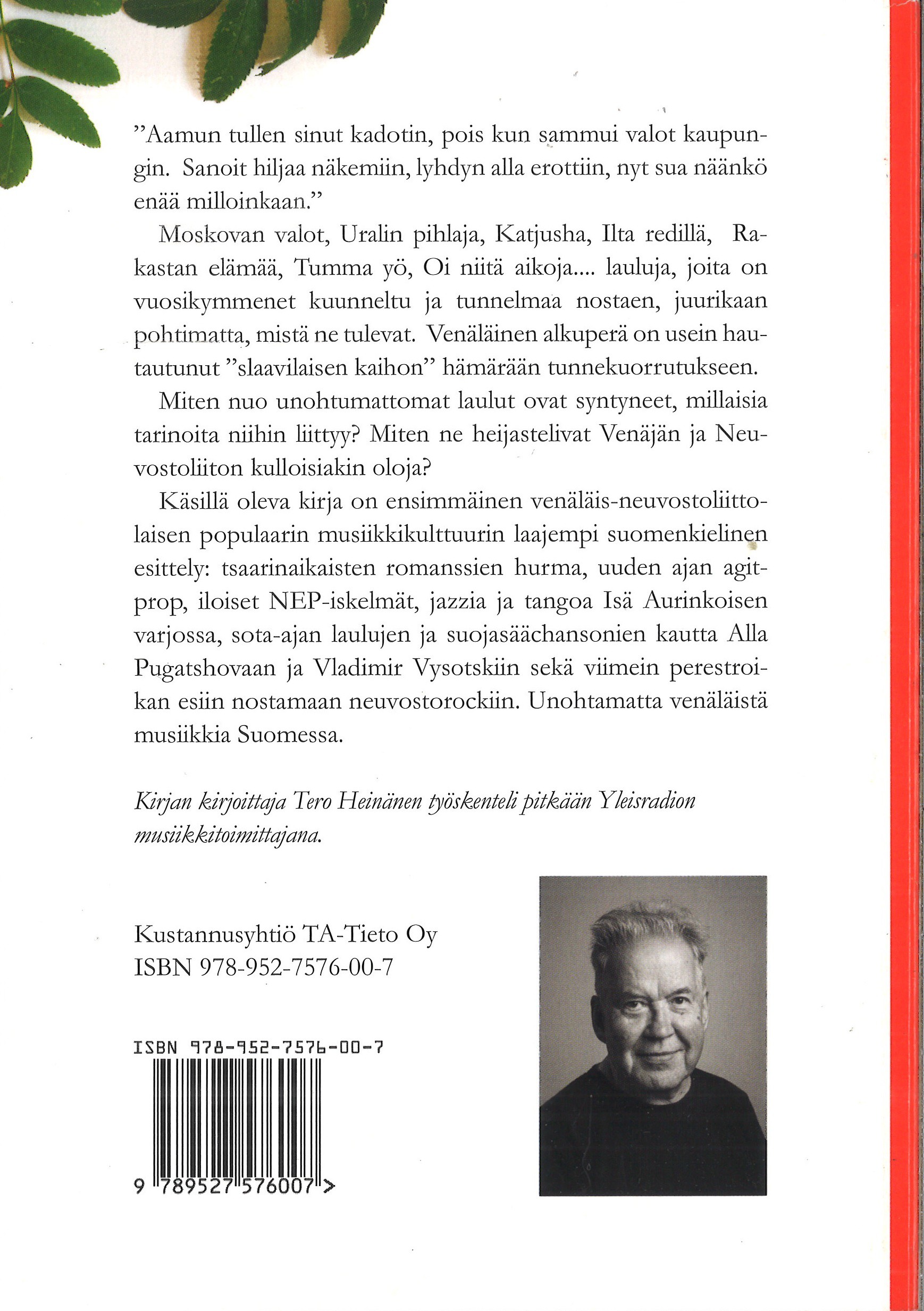 Toimittaja Tero Heinänen on tehnyt ensimmäisen laajan suomenkielisen esittelyn venäläis-neuvostoliittolaisesta populaarista musiikkikulttuurista: tsaarinaikaisten romanssien hurma, uuden ajan agitprop, iloiset NEP-iskelmät, jazzia ja tangoa Isä Aurinkoisen varjossa, sota-ajan laulujen ja suojasään chansonien kautta Alla Pugatshovaan ja Vladimir Vysotskiin sekä viimein perestroikan esiin nostamaan neuvostorockiin. Unohtamatta venäläistä musiikkia Suomessa.