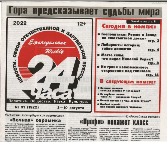 The weekly 24 chasa (Eng. "24 Hours") is the first Russian digest. It was created in February 1989 and made it possible to monitor information and journalistic media with minimal time. Until now, this unique publication attracts a wide mass of readers because of the hundreds of titles in the Russian and foreign press, it publishes the most interesting, relevant and educational materials, primarily articles on socio-political life, the development of science and culture, materials on health topics, relationships between men and women and many others that affect the interests of every person.