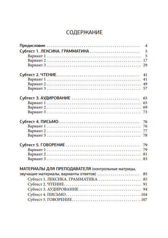 Задания субтестов "Лексика. Грамматика", "Чтение" и "Аудирование" снабжены рабочими и контрольными матрицами. Задания субтестов "Письмо" и "Говорение" снабжены вариантами ответов.