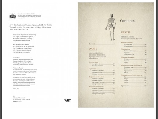 This feature is characteristic of all V.A. Mogilevtsev's teaching aids. It is called "Mogilevtsev's methodology". Muscles, bones, ecorsche and examples from classics are presented on one spread. It helps to understand more quickly how the plasticity of the most complex form of the human figure is construed and how it was interpreted by the great masters of the past.