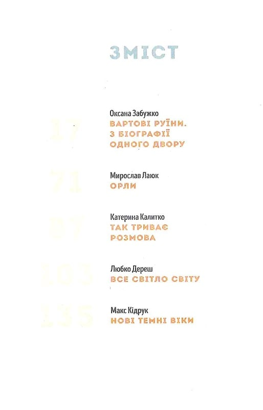П'ять цiлковито рiзних iсторiй, як за настроєм, так i за жанровим наповненням, розмiстилися пiд обкладинкою. Тут герої проводять свої життя, осмислюючи помилки, будуючи плани на майбутнє, простежуючи невблаганний зв'язок мiж дрiбницями особистого i великими наслiдками суспiльного. Через усi iсторiї прозирає спiльний герой - мiсто Луцьк - десь натяком, десь прямою згадкою. Мiсто огортає своїм теплом усiх персонажiв, та радо запрошує до себе читачiв.