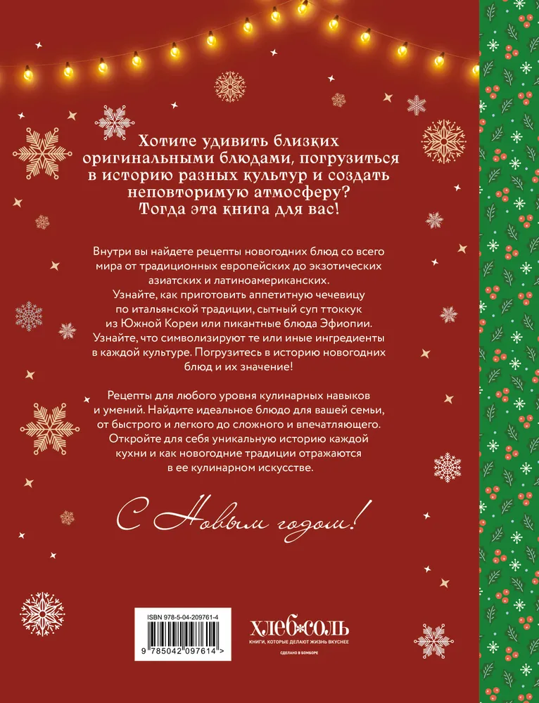 Ustali ot olive i seledki pod shuboj? Mechtaete o volshebnom novogodnem stole, kotoryj udivit i poraduet blizkikh? Togda eta kniga - vash bilet v gastronomicheskoe puteshestvie po samym jarkim i vkusnym novogodnim traditsijam raznykh stran! Predstavte: pod boj kurantov vy podnimaete bokal ne tolko za schaste, no i za novyj, neizvedannyj vkus. Na vashem stole - ne prosto nabor privychnykh bljud, a nastojaschee proizvedenie iskusstva, sozdannoe po retseptam, berezhno khranimym vekami v raznykh ugolkakh planety. V etoj knige my sobrali luchshie novogodnie retsepty so vsego mira, chtoby vy smogli: * Okunutsja v atmosferu prazdnika. Uznajte, kak vstrechajut Novyj god pod zharkim solntsem Avstralii i v zasnezhennoj Evrope, v tainstvennoj Azii i koloritnoj Latinskoj Amerike! * Prigotovit neobychnye i vkusnye bljuda. Ot italjanskoj chechevitsy, prinosjaschej bogatstvo, do japonskoj lapshi, simvolizirujuschej dolgoletie, - kazhdyj retsept neset v sebe glubokij smysl i nepovtorimyj vkus. * Udivit svoikh gostej. Sozdajte nezabyvaemyj novogodnij stol, kotoryj stanet glavnym ukrasheniem prazdnika. * Rasshirit svoj kulinarnyj krugozor. Poznakomtes s sekretami prigotovlenija natsionalnykh bljud i poprobujte novye produkty i spetsii. * Sozdat svoi semejnye traditsii. Prigotovte vmeste s blizkimi novye bljuda i vnesite ikh v svoju kopilku novogodnikh vospominanij.