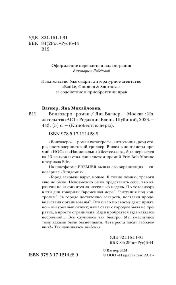 В конце 2019 года на платформе ТНТ-PREMIER выходит киносериал "ЭПИДЕМИЯ" - экранизация бестселлера Яны Вагнер "ВОНГОЗЕРО".