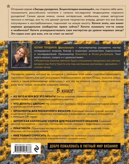 "Мозаичное вязание крючком будто специально придумано для уютных вечеров под Агату Кристи или под неспешные разговоры с друзьями" - считает автор этой необыкновенной книги Юлия Гендина - популярный блогер, мастер интерьерного вязания, организатор самых разных онлайн-фестивалей, слетов и других мероприятий, объединяющих увлеченных вязальщиц. Вязать нужно весело, легко, так, чтобы получать удовольствие и от процесса, и от результата.