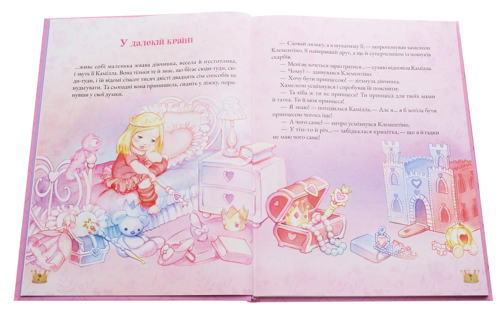 Майже кожна дiвчинка мрiє бути принцесою.Прагне цього й маленька Камiлла.Однак для досягнення мети вона має повiрити у свої сили. А допоможе їй у цьому й надихатиме iсторiями про чарiвних, рiшучих i добрих принцес хамелеон Клементiно. Разом iз героями книжки читачi поринуть у магiчний свiт Неозорого Саду та Королiвства Моря, вiдвiдають країну вогнедишних драконiв i гомiнких зiрок. А щоб розважитись i вiднайти власнi таланти, намалюють портрет i неймовiрний замок, розгадають загадки та складуть вiрша про найчарiвнiших принцес на свiтi - про самих себе.