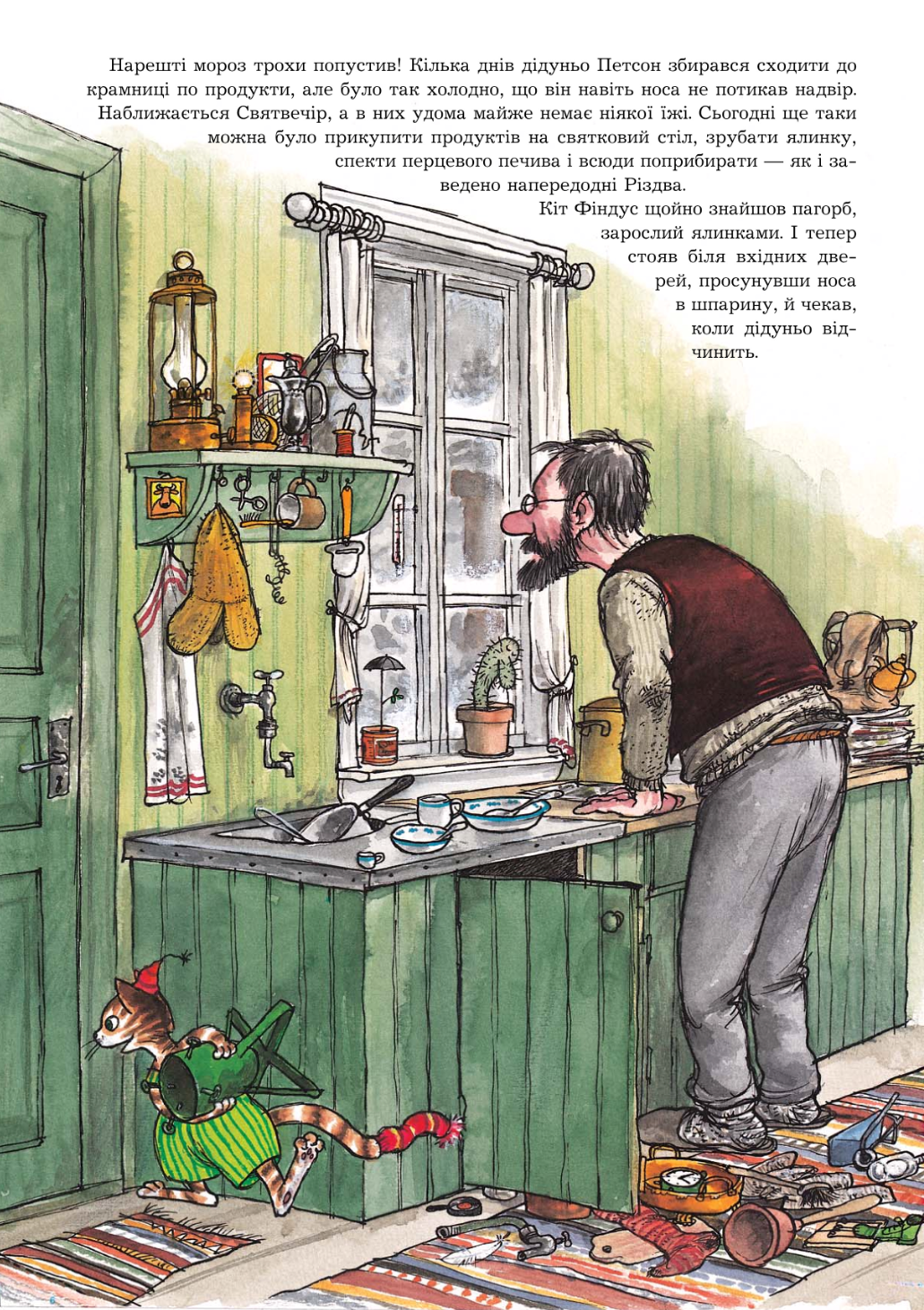 От издателя: Дiдуньо Петсон i кiт Фiндус заходилися прибирати до Рiздва. I майже з усiм упоралися. Лишилося тiльки подбати про ялинку та святковий стiл. I саме тодi стається те, чого не мало статися. Петсон посковзнувся i так забив ногу, що не мiг сходити у крамницю по продукти до рiздвяного стола, не кажучи вже про ялинку... Так би їм i випало сумне Рiздво, якби до Петсона не прийшли гостi, про яких анi вiн сам, анi Фiндус не могли навiть мрiяти.