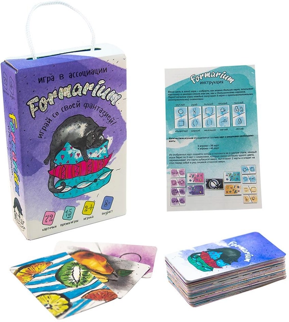 "Formarium" (Формариум) - фантастическая карточная игра в ассоциации. В игре вы найдете 72 карты, среди которых будут карты с рисунками и карты с разными свойствами. Цель игры - угадывать свойства карт в центре стола, так же, как и большинство игроков. В ситуации, когда все игроки выложили одинаковое свойство или все разное - никто не зарабатывает баллы. С настольной игрой "Formarium" Strateg вы убедитесь, что каждый человек в одинаковых предметах видит совершенно разные формы и характеристики! Это очень увлекательно!