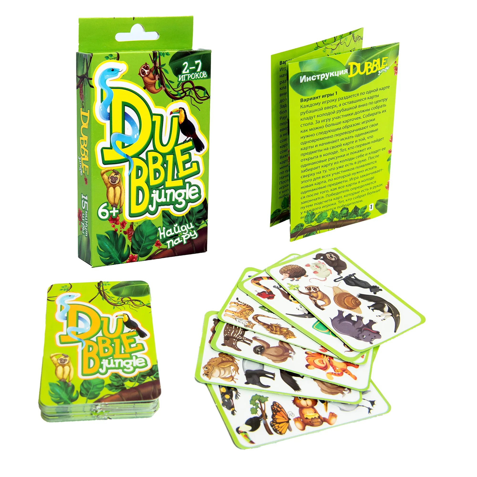 "Dubble jungle" (Дабл Джангл) - активная карточная игра на быстрый поиск совпадений. Детям необходимо сравнивать свою карту с другими картами и быстрее других игроков находить одинаковые рисунки. Победителем становится тот, кто соберет больше карт с совпадениями. В этой игре придется использовать всю свою внимательность, ловкость и память. Поэтому веселое занятие превратится в настоящую тренировку.