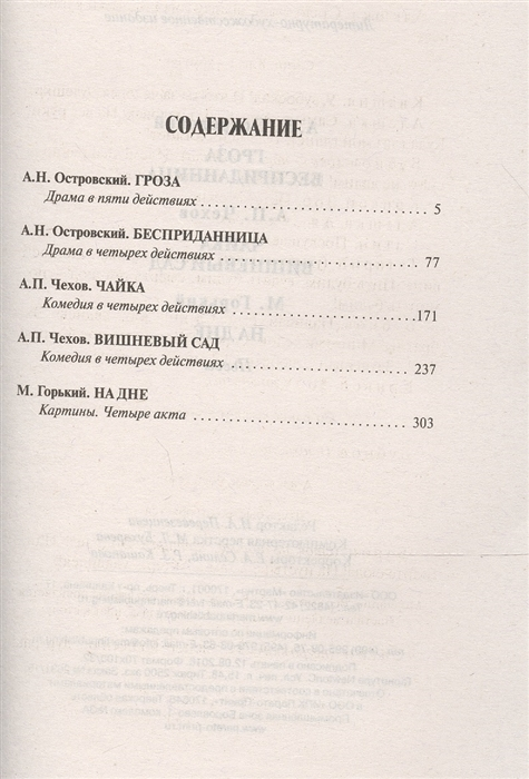 A. Ostrovskij, A. Chekhov i M. Gorkij - genialnye reformatory i novatory stseny, korennym obrazom izmenivshie teatr. V etu knigu voshli pjat znamenitykh pes velikikh dramaturgov - "Groza", "Bespridannitsa", "Vishnevyj sad", "Chajka", "Na dne". Samobytnye geroi, perezhivajuschie krushenie nadezhd, razocharovanie ili neudachnuju ljubov, pytajuschiesja razobratsja, "chto luchshe, istina ili sostradanie"; jumor, poroj teplyj i mjagkij, a inogda - khlestkij i oblichitelnyj; jarkie monologi, podcherkivajuschie glubinu vnutrennego mira cheloveka - vsjo eto delaet proizvedenija etikh masterov po-prezhnemu aktualnymi. Bolee stoletija pesy ne skhodjat s podmostkov teatrov mira i uspeshno ekranizirovany.