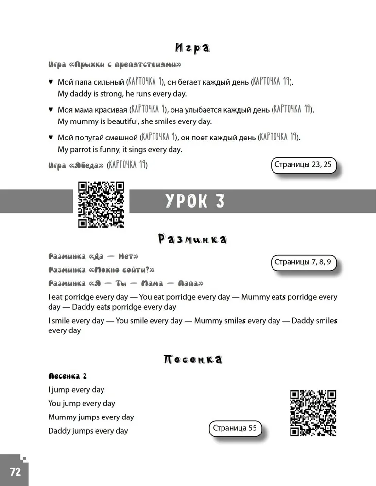 Вы уже знакомы с "Волшебным пианино"? Ваши дети уже освоили все уроки из книги "Как научить ребенка говорить по-английски. Игры, песенки и мнемокарточки" и ждут продолжения? Вы сыграли во все игры, а заодно освоили три времени английского глагола (настоящее простое, настоящее продолженное и будущее)? Вы спели все песенки и теперь ребята то и дело мурлычут их, играя в свои игрушки, и даже не замечают, что они в этот момент отрабатывают английские грамматические конструкции? Дети давно замучили вас вопросом, когда же у них будет новая карточка? В таком случае мы с удовольствием представляем вашему вниманию продолжение нашего курса! В этой книге вас ждут новые игры, новые песенки, новые разминки и, конечно, новые мнемокарточки! Кроме того, все уроки сопровождаются аудиозаписями, которые вы сможете скачать, перейдя по ссылке или по QR-коду.