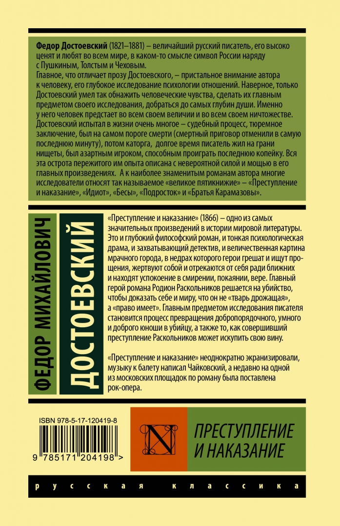 "Prestuplenie i nakazanie" (1866) - odno iz samykh znachitelnykh proizvedenij v istorii mirovoj literatury. Eto i glubokij filosofskij roman, i tonkaja psikhologicheskaja drama, i zakhvatyvajuschij detektiv, i velichestvennaja kartina mrachnogo goroda, v nedrakh kotorogo geroi greshat i ischut proschenija, zhertvujut soboj i otrekajutsja ot sebja radi blizhnikh i nakhodjat uspokoenie v smirenii, pokajanii, vere. Glavnyj geroj romana Rodion Raskolnikov reshaetsja na ubijstvo, chtoby dokazat sebe i miru, chto on ne "tvar drozhaschaja", a "pravo imeet". Glavnym predmetom issledovanija pisatelja stanovitsja protsess prevraschenija dobroporjadochnogo, umnogo i dobrogo junoshi v ubijtsu, a takzhe to, kak sovershivshij prestuplenie Raskolnikov mozhet iskupit svoju vinu.