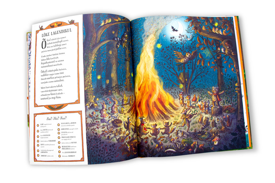 Põnevust jätkub raamatu igale lehepaarile: mis saladusi ja lugusid peidab mets? Suurelt pildilt tuleb lapsel üles leida rubriigis "Kes? Mis? Kus?" nimetatud detail või väike stseen, milles osaleb keegi metsarahva seast. Iga pildi juures on luuletus, mille teemaks on valitud mõni lapse elus oluline sündmus või tegevus, näiteks sünnipäev, koolitund või -mäng, piknik, onniehitus, lõkketegemine jms. Raamat on üles ehitatud aastaringile, iga aastaaja kohta on neli lehepaari. Peale selle jagab raamatu lõpus huvitavat infot "Loodusrada".