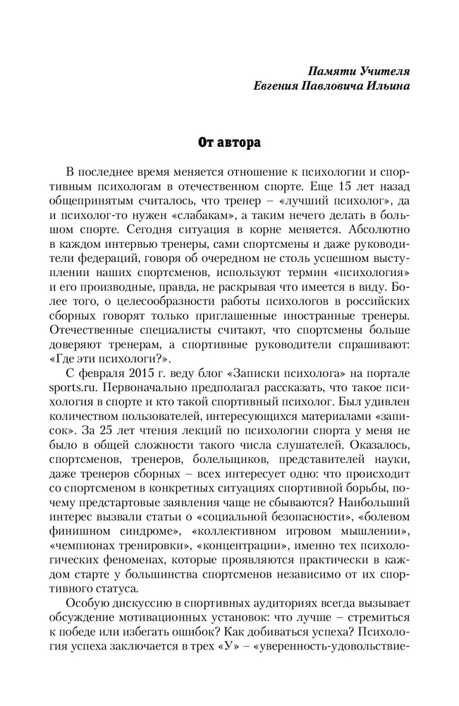 В книге обобщены теоретические, научно-исследовательские и научно-практические работы по психологической проблематике в сфере спорта на протяжении 30 лет; раскрываются роль и значение психического состояния, мотивационной сферы, диалога двух "Я", осознанность целей, комплексности психодиагностики, психотехники формирования необходимых качеств психики спортсмена. Для спортивных психологов, тренеров, спортсменов, преподавателей вузов физической культуры и спорта.