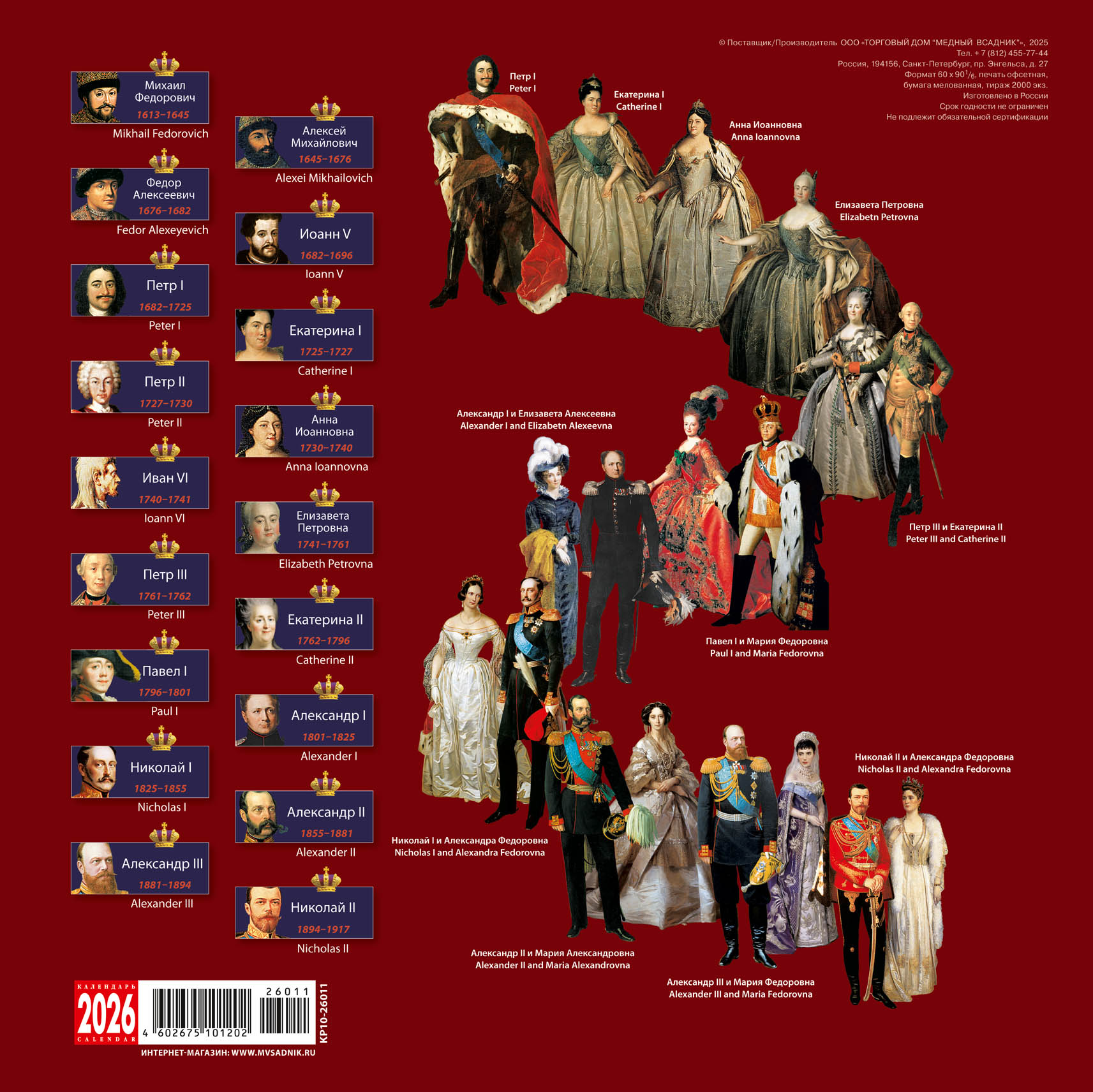 Настенный календарь " Русские цари" на 2026 год дает представление об этапах исторического развития России, связанных с правлением определенных самодержцев, чьи портреты, сопровождаемые датами их жизни, воспроизводятся в календаре.