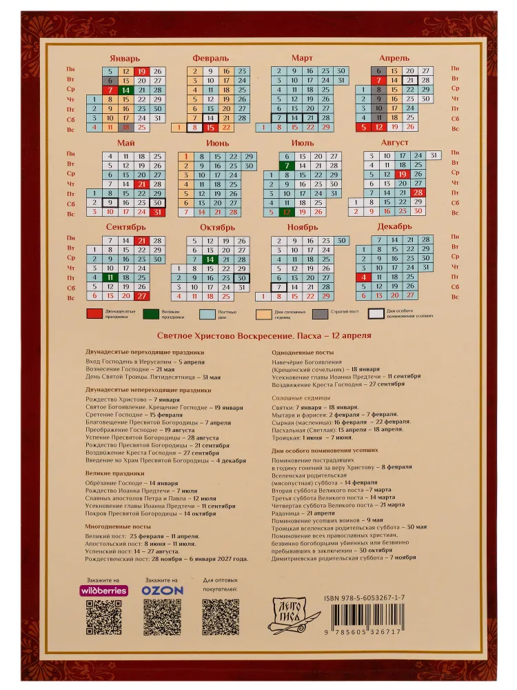 Pravoslavnyj kalendar na 2026 god s Vetkhozavetnymi, Evangelskimi i Apostolskimi chtenijami, paremijami, troparjami i kondakami na kazhdyj den goda . Velikoj pokajannyj kanon, Chetvertok velikogo kanona, Subbota Akafista, Paskhalnyj kanon. Eto izdanie, kotoroe pomozhet byt v kurse vsekh sobytij bogosluzhebnoj zhizni Russkoj Pravoslavnoj Tserkvi v techenie kalendarnogo goda. Tak zhe izdanie etogo goda dopolneno paremijami.