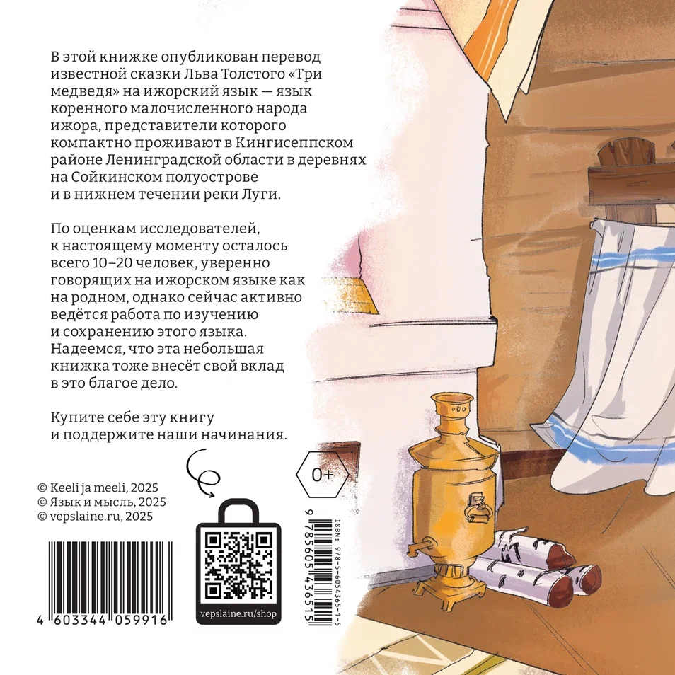 V etoj knizhke opublikovan perevod izvestnoj skazki Lva Tolstogo "Tri medvedja" na izhorskij jazyk - jazyk korennogo malochislennogo naroda izhora, predstaviteli kotorogo kompaktno prozhivajut v Kingiseppskom rajone Leningradskoj oblasti v derevnjakh na Sojkinskom poluostrove i v nizhnem techenii reki Lugi.