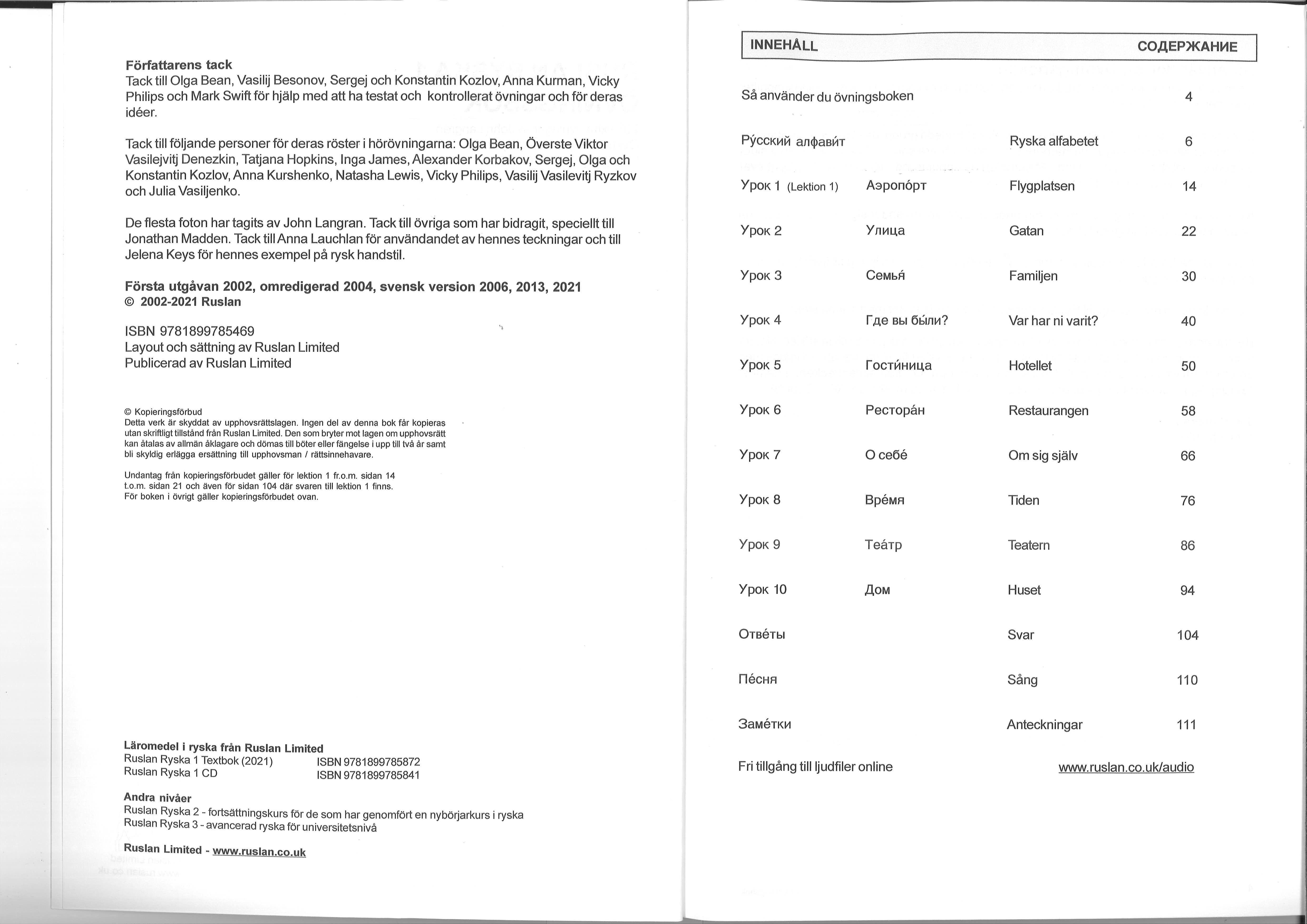 - Dialoger för att introducera ny vokabulär och nya meningskonstruktioner när vi följer Ivan, Vadim, Ljudmila, hennes familj och vänner i deras äventyr. En vokabulär med nya ord i den ordning de kommer. Bakgrundsinformation på svenska och tydliga grammatikförklaringar. Övningar baserade på det nya språket samt läs - och skrivövningar. Avlyssningsövningar med tillhörande text längst bak i boken. Talövningar med rollspelssituationer, förslag till parövningar och språklekar. I slutet av boken finns facit till övningarna samt en rysk-svensk ordlista.