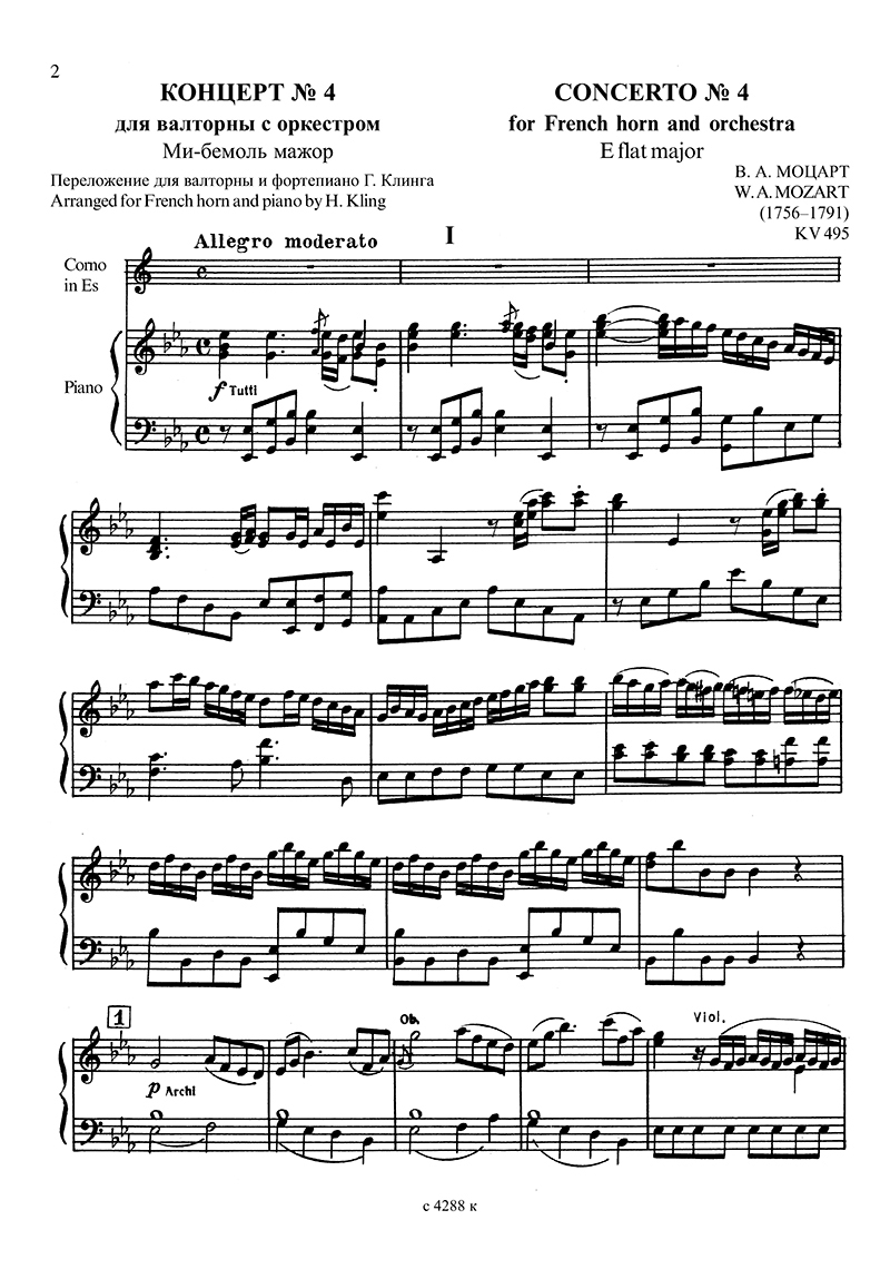 Концерт No. 4 для валторны с оркестром. Ми-бемоль мажор. KV495. Клавир и партия