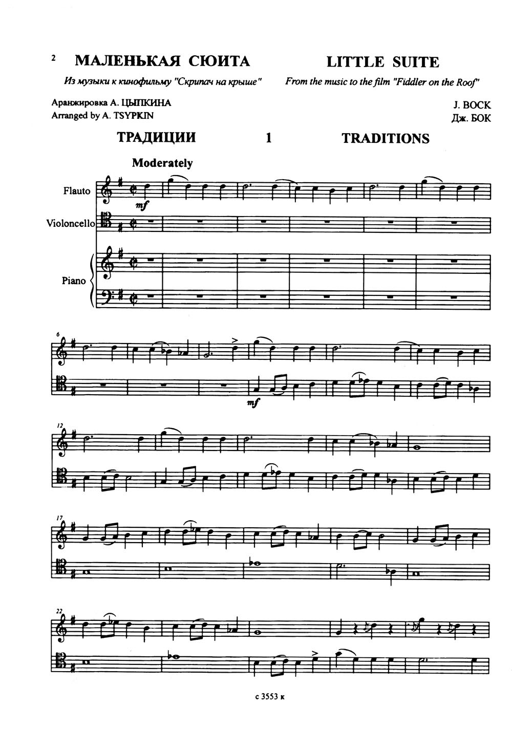 The Litte Suite for flute, cello and piano imbibed most striking themes from Bock's "Fiddler". This garish concert composition is rather accessible for any amateur ensemble. Неге you are the Jewish traditional clesmer music making, the kind of unрrovisаtion peculiar for the Eastern Europe.