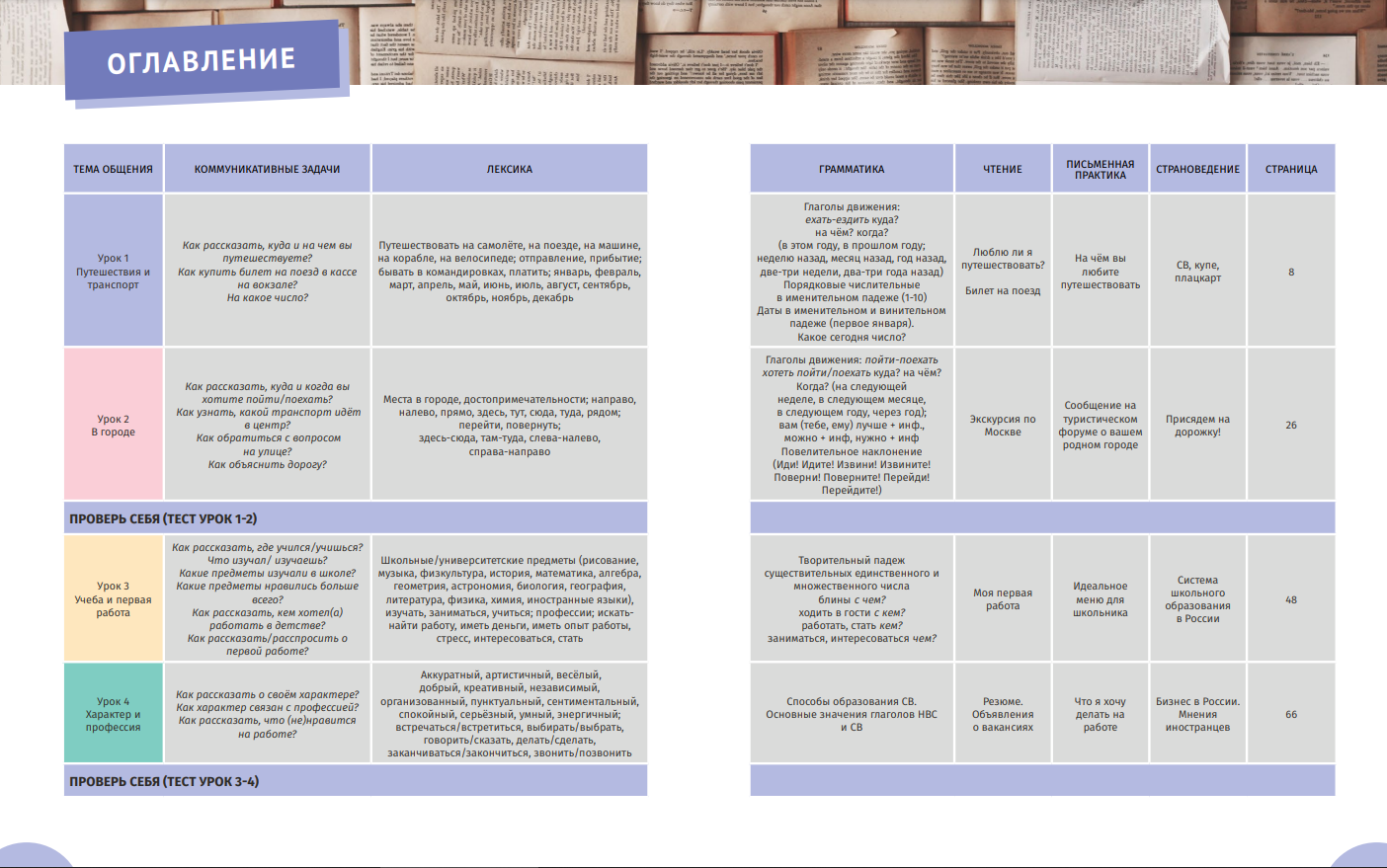 Dannyj uchebnik ispolzuetsja v kachestve osnovnoj knigi dlja nachalnogo urovnja. On osnovan na kommunikativnom podkhode i okhvatyvaet naibolee chasto vstrechajuschiesja povsednevnye situatsii. V nem takzhe dajutsja rechevye obraztsy, kotorye legko ispolzovat v realnoj zhizni, a takzhe objasnjaetsja russkaja grammatika v jasnoj i effektivnoj forme. On soderzhit:
