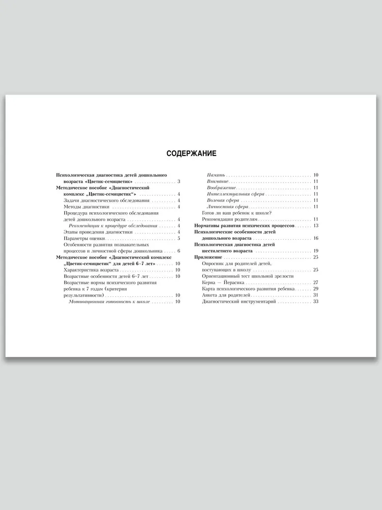 Diagnosticheskij albom "Tsvetik-semitsvetik" - eto kompleks diagnosticheskikh metodik, prednaznachennyj dlja issledovanija razvitija psikhicheskikh protsessov i individualnykh osobennostej detej doshkolnogo vozrasta. V albome podrobno opisana protsedura psikhologicheskoj diagnostiki, rassmotreny psikhologicheskie osobennosti detej doshkolnogo vozrasta, a takzhe privedeny vozrastnye normy psikhicheskogo razvitija doshkolnikov: vosprijatija, pamjati, vnimanija, voobrazhenija, intellekta i psikhofiziologicheskoj sfery. Metodicheskie rekomendatsii soprovozhdajutsja obemnym diagnosticheskim instrumentariem.