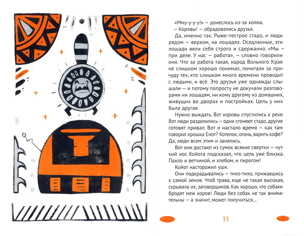 Однажды летом молодой Койот решает покинуть свою стаю и начать взрослую жизнь. Как построить дом? Как добывать пропитание? Хорошо, что ему повстречался Енот - вдвоем-то куда веселее! Поселились друзья в большой норе и стали промышлять: то у пастухов припасы стащат, то в курятник проберутся через хоречий лаз. Вспоминают хитрости родичей и за людьми наблюдают, опыту набираются. Всё-то друзьям интересно: как орлы рыбу ловят, как люди сеть плетут и что там, в дальних краях, где Небесный народ живет. И впереди у них приключений - не счесть!