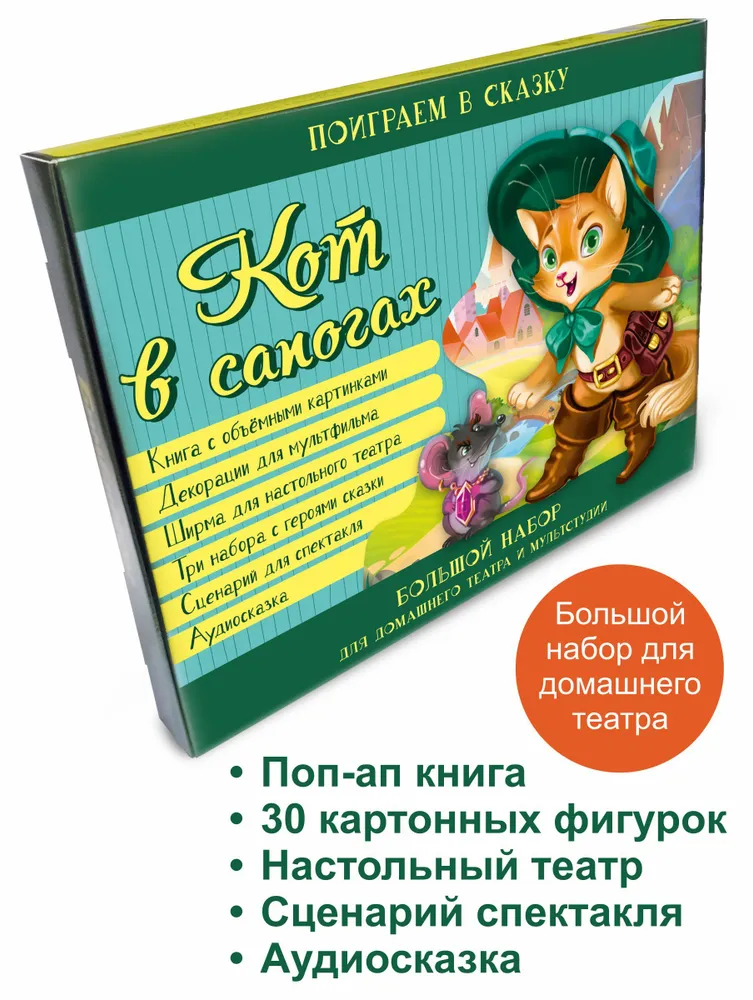 Detskaja kniga skazka Kot v sapogakh s naborom dlja igry v domashnij detskij kukolnyj teatr i multstudiju. Vy davno mechtali o takom nabore, pravda? Vnutri volshebnoj korobki tselyj skazochnyj mir, ot kotorogo pridut v vostorg i deti, i vzroslye. Ljubimuju skazku Kot v sapogakh teper mozhno ne tolko chitat, v nejo mozhno igrat! Prichjom kazhdyj raz igra budet novoj, a znachit, osobenno interesnoj. Uzhe ne terpitsja nachat? Otkryvajte skoree, skazka nachinaetsja!