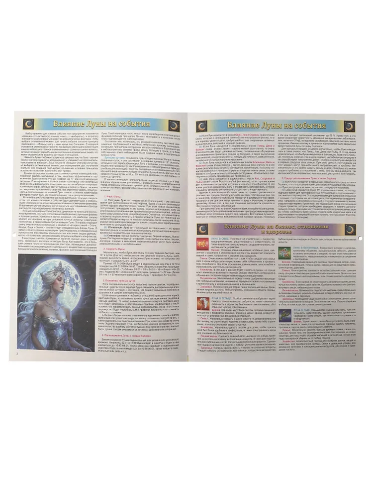 В календаре большое внимание уделено влиянию Луны на энергетику человека. Вы узнаете о влиянии на здоровье и повседневную жизнь различных лунных фаз и лунных четвертей на недельные ритмы в течение каждого месяца. Отдельное направление представляет описание лунных дней, их магические символы и состояние человека под их энергоинформационным воздействием. В каждой клетке для каждого дня года приводится расшифровка этого влияния в разделах "магия дня", описываются удачные ситуации, дела, любовные отношения и состояние здоровья.