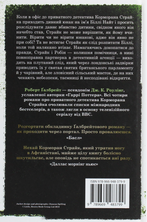 Серiя-бестселер свiтового рiвня! Четверта частина! Коли в офiс до приватного детектива Корморана Страйка приходить дивний юнак на iм'я Бiллi Найт i просить розслiдувати давнє вбивство дитини, свiдком якого вiн начебто став. Стайк не може вирiшити, як йому вчинити. Вiрити чи не вiрити юнаковi, адже вiн явно не при собi? Та не встигає Страйк як слiд розпитати Бiллi, коли той налякано втiкає. Намагаючись докопатися до правди, Страйк i Робiн - колишня помiчниця, а нинi повноправна партнерка в детективнiй агенцiї - виходять на плутаний слiд, який через лондонськi задвiрки приводить їх у святая святих британського парламенту й у чарiвний, але зловiсний сiльський маєток, де на них чекають небезпеки, таємницi й несподiванi вiдкриття.