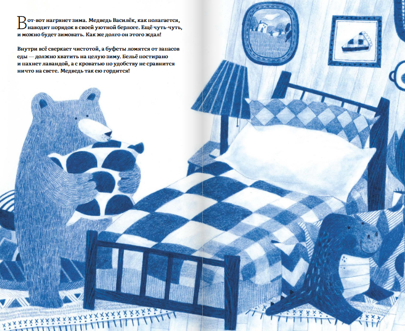 Вот-вот наступит зима. Медведь Василёк вовсю готовится к ней в своём уютном домике. Удобная кровать застелена свежим бельём, в камине потрескивают дрова, на плите закипает чайник... Но вот незадача: в доме не осталось ни одного черничного пирога! А что за зима без пирога с черникой? Кажется, медведю придётся выйти на мороз... Сможет ли он побороть боязнь всего нового и неизвестного? Порой даже самые маленькие шаги навстречу страхам могут привести к приятным открытиям