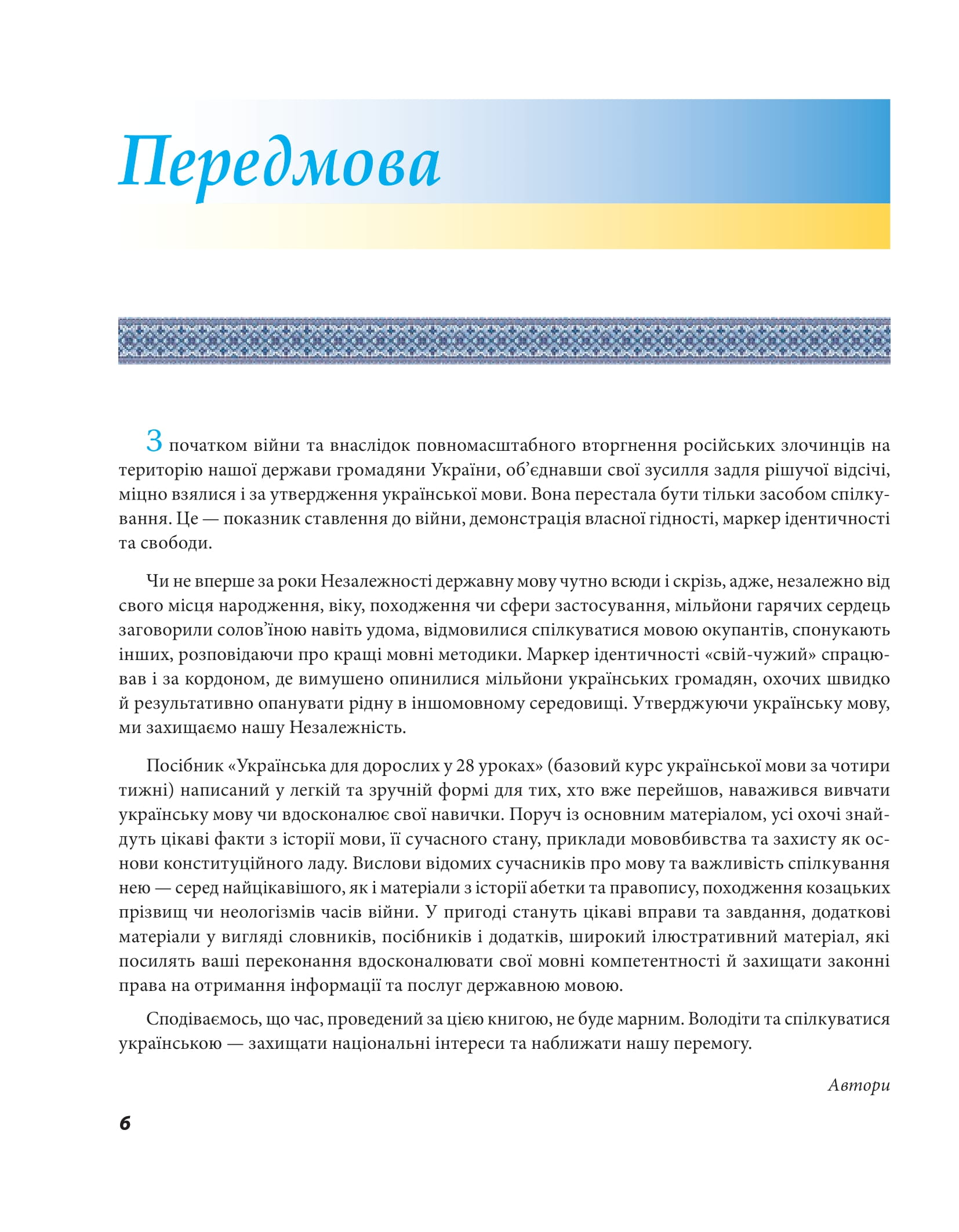 Proponovanij posibnik priznachenij dlja tikh, khto vzhe perejshov na ukrajinsku movu, lishe navazhivsja rozpochati jiji vivchennja chi vdoskonaljuje svoji navichki. Vin okhopljuje zmist bazovogo kursu, jakij mozhna opanuvati za 4 tizhni, podilenij na 28 urokiv i dopovnenij 15 dodatkami.Usi vidomosti vikladeno v legkij, dostupnij ta zruchnij dlja sprijnjattja formi, tomu materiali posibnika mozhe buti vikoristano jak dlja navchannja v grupakh pid kerivnitstvom vikladacha abo konsultanta, tak i dlja samostijnoji individualnoji roboti. Aktualni j zakhoplivi temi ta jikh suchasne j riznomanitne napovnennja ne lishe zatsikavljat chitachiv i nadadut jim neobkhidni znannja, a j posiljat jikhnje pragnennja vdoskonaljuvati vlasni movni kompetentnosti, a takozh zakhischati svoji zakonni prava na otrimannja informatsiji ta poslug derzhavnoju movoju.Vidannja mistit korisnij ta tsikavij teoretichnij i praktichnij material, tsikavi fakti z istoriji movi ta jiji suchasnogo stanu, vislovi vidomikh suchasnikiv pro ukrajinsku movu ta vazhlivist spilkuvannja neju, interaktivni vpravi ta zavdannja, poklikannja na dodatkovi materiali u vigljadi slovnikiv, posibnikiv ta internet-resursiv.