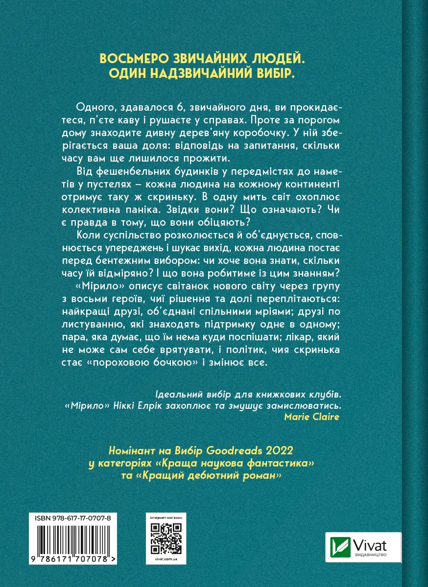 Одного, здавалося б, звичайного дня, ви прокидаєтеся, п'єте каву i рушаєте у справах. Проте за порогом дому знаходите дивну дерев'яну коробочку. У нiй зберiгається ваша доля: вiдповiдь на запитання, скiльки часу вам ще лишилося прожити. Вiд фешенебельних будинкiв у передмiстях до наметiв у пустелях - кожна людина на кожному континентi отримує таку ж скриньку. В одну мить свiт охоплює колективна панiка. Звiдки вони? Що означають? Чи є правда в тому, що вони обiцяють? Коли суспiльство розколюється й об'єднується, сповнюється упереджень i шукає вихiд, кожна людина постає перед бентежним вибором: чи хоче вона знати, скiльки часу їй вiдмiряно? I що вона робитиме iз цим знанням? "Мiрило" описує свiтанок нового свiту через групу з восьми героїв, чиї рiшення та долi переплiтаються: найкращi друзi, об'єднанi спiльними мрiями; друзi по листуванню, якi знаходять пiдтримку одне в одному; пара, яка думає, що їм нема куди поспiшати; лiкар, який не може сам себе врятувати, i полiтик, чия скринька стає "пороховою бочкою" i змiнює все.