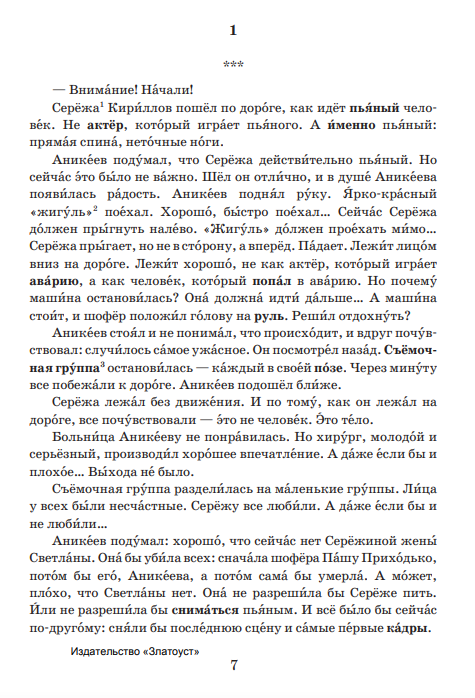 Adaptirovannyj rasskaz populjarnoj pisatelnitsy (2300 slov s oporoj na leksicheskij minimum pervogo sertifikatsionnogo urovnja (B1). Leksicheskie i stranovedcheskie kommentarii, udarenija, kljuchi, slovar, illjustratsii.