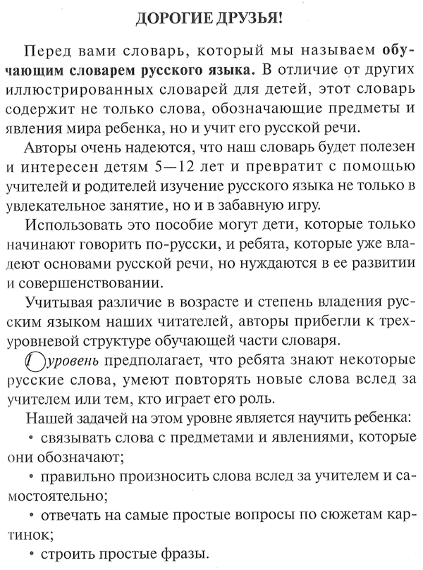 This dictionary will help the children to learn the Russian letters and more than 400 Russian words. Coloured funny pictures of the dictionary present objects familiar to every child. The dictionary consists of two parts: an alphabetic part and a thematic part as well as illustrated exercises in the form of the games aimed at the development of a child's speaking habits. The book is designed for children learning Russian as a foreign language.