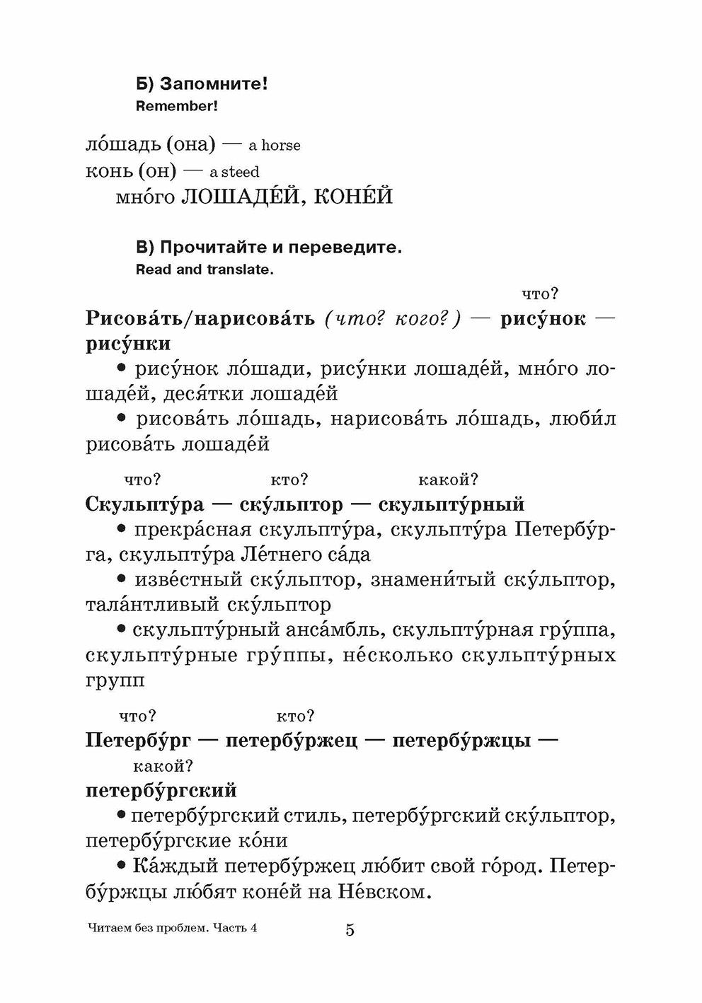 READING WITHOUT PROBLEMS. IV Issue. The book is for those who know Russian very little yet, but would very much love to start reading something basic in terms of the language, not the essence. Short and interesting author's texts, Russian-English dictionary for each text, exercises for classroom and independent work. Published in three volumes.