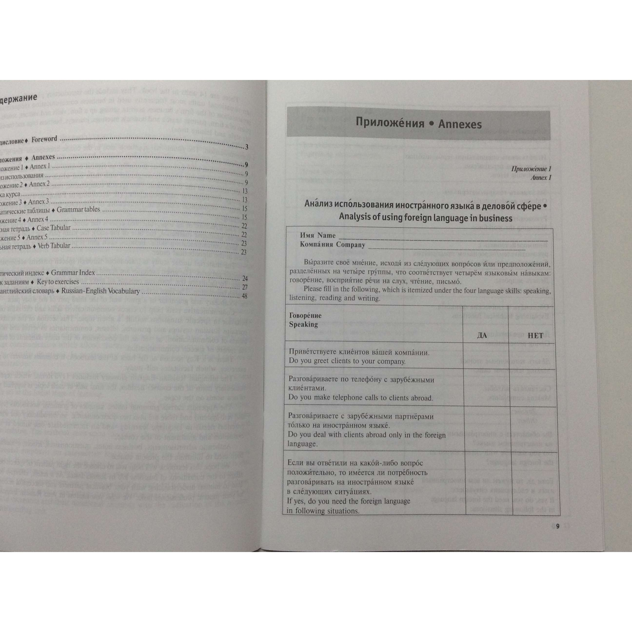 The main aim of the book is to facilitate intercultural communication. It includes three parts, a multimedia CD and is designed for English speaking foreigners who begin to study Russian to acquire business communication skills in various spheres: economics, production, trade, politics, culture, science and education. It can be used both for classroom activities and independent studies, for individual and group work. The material covers 100-120 hours of the classroom work. The course provides opportunities for students to learn the language through developing practical skills and intensive training. There are 14 units in the book. They include the introductory phonetic course and 10 situational units most widely used in business communication. The bilingual Russian-English glossary includes about 1170 items.