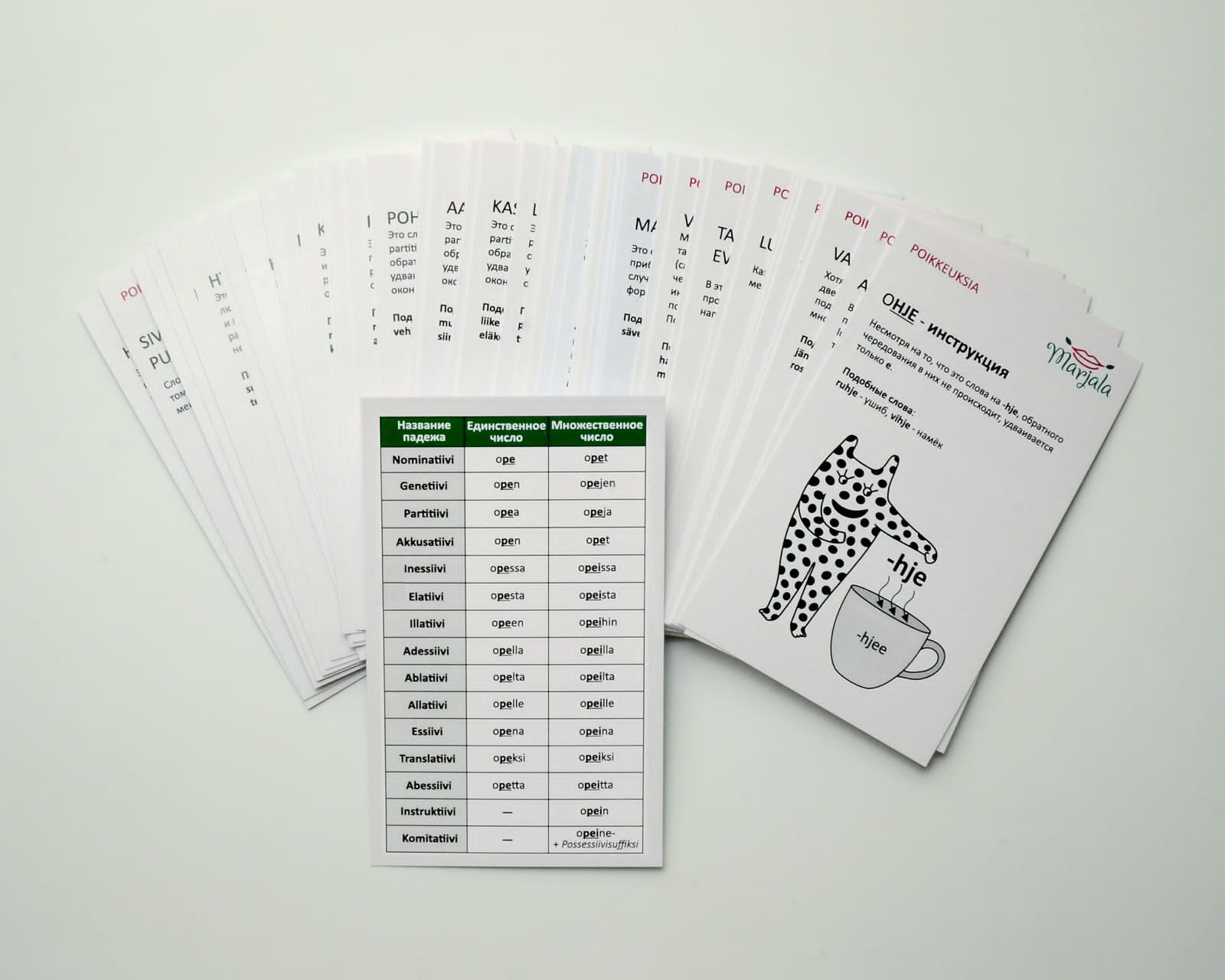 Etot nabor pomozhet vyuchit khitrye finskie suschestvitelnye i prilagatelnye v raznykh padezhakh, ne osobo zadumyvajas o pravilakh. Odnako v kazhdoj kartochke est nebolshoj grammaticheskij kommentarij dlja ljubitelej vsjo ponimat. V nabore 47 kartochek, vkljuchaja kartochku so shpargalkoj po cheredovanijam i mestoimenijam i kartochka s instruktsiej. V dannom nabore mozhno najti vse slozhnye sluchai izmenenija imen i tseluju stopku iskljuchenij.