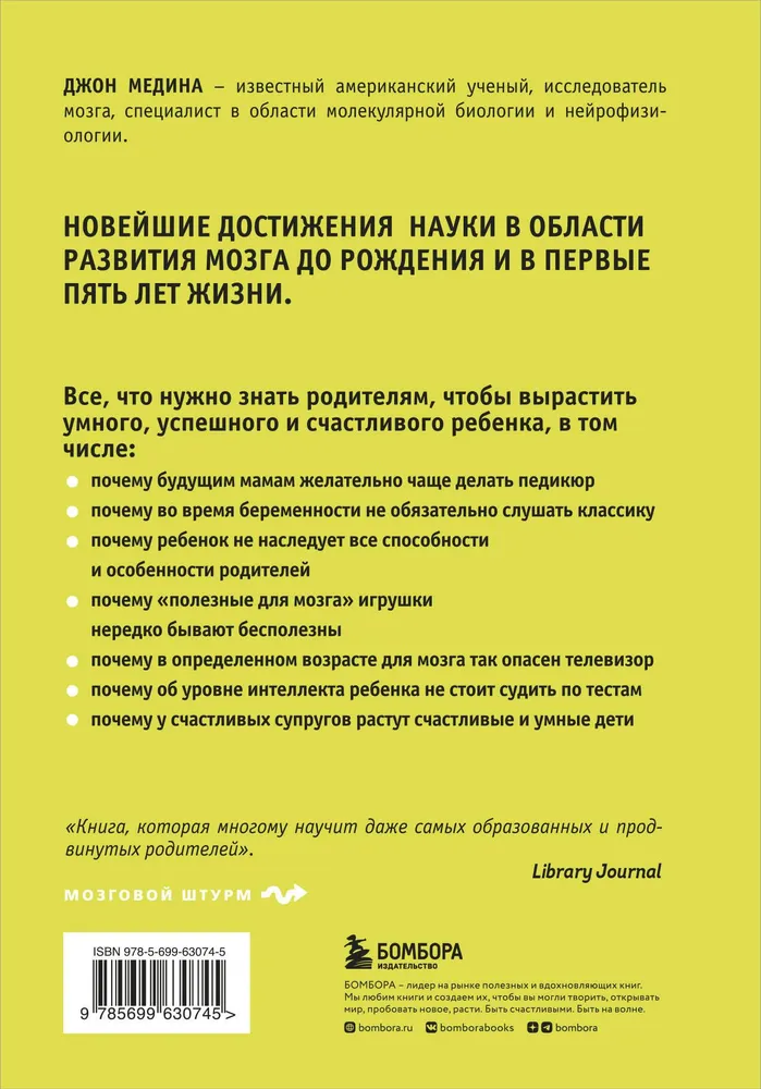 Osnovnaja ideja knigi: vospitanie rebenka - eto v pervuju ochered razvitie ego mozga, vkljuchaja vnutriutrobnyj period. Iskhodja iz etogo, Dzh. Medina objasnjaet, chto i kak sleduet delat roditeljam do i posle rozhdenija malysha, chtoby vyrastit umnogo, tseleustremlennogo, schastlivogo, eticheski sostojatelnogo cheloveka. Vnimanie udeljaetsja ne tolko vospitaniju i rannemu razvitiju, no i zdorovym otnoshenijam v seme. Interesno vygljadit razvenchivanie takikh populjarnykh mifov kak: "esli vo vremja beremennosti slushat klassiku, rebenok roditsja bolee razvitym, "chem bolshe "poleznykh dlja mozga" igrushek, tem luchshe" i dr.