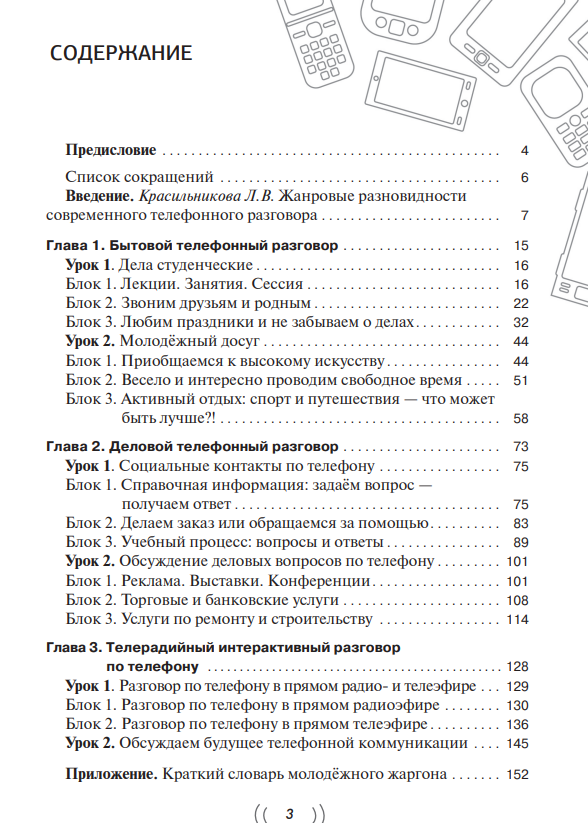 Пособие состоит из трёх глав, в каждой из которых представлены: этикетные выражения и речевые стереотипы современного телефонного разговора; диалоги, иллюстрирующие телефонный разговор в типичных ситуациях общения; задания, направленные на развитие восприятия и понимания аутентичных телефонных текстов и на самостоятельное построение высказываний по телефону.