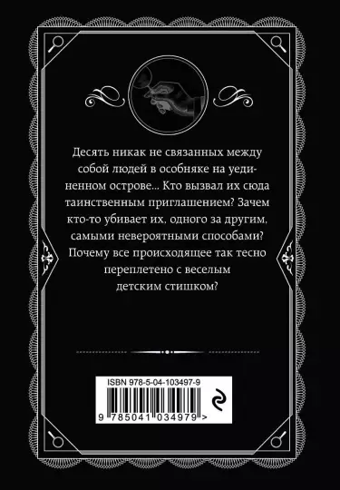 Десять никак не связанных между собой людей в особняке на уединенном острове... Кто вызвал их сюда таинственным приглашением? Зачем кто-то убивает их, одного за другим, самыми невероятными способами? Почему все происходящее так тесно переплетено с веселым детским стишком?