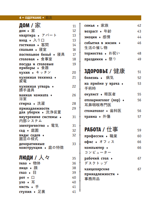 Японско-русский визуальный словарь содержит более 3500 слов и выражений и около 2500 иллюстраций.