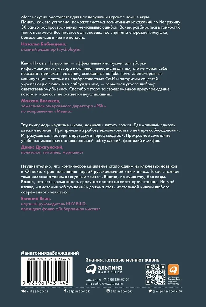 "Анатомия заблуждений" - первая книга по критическому мышлению, написанная отечественным автором. В ней вы найдете множество реальных примеров и кейсов, иллюстраций и исследований, а также практических упражнений для закрепления полученных знаний на практике. Эта книга способна перевернуть ваши представления о себе и окружающем мире.
