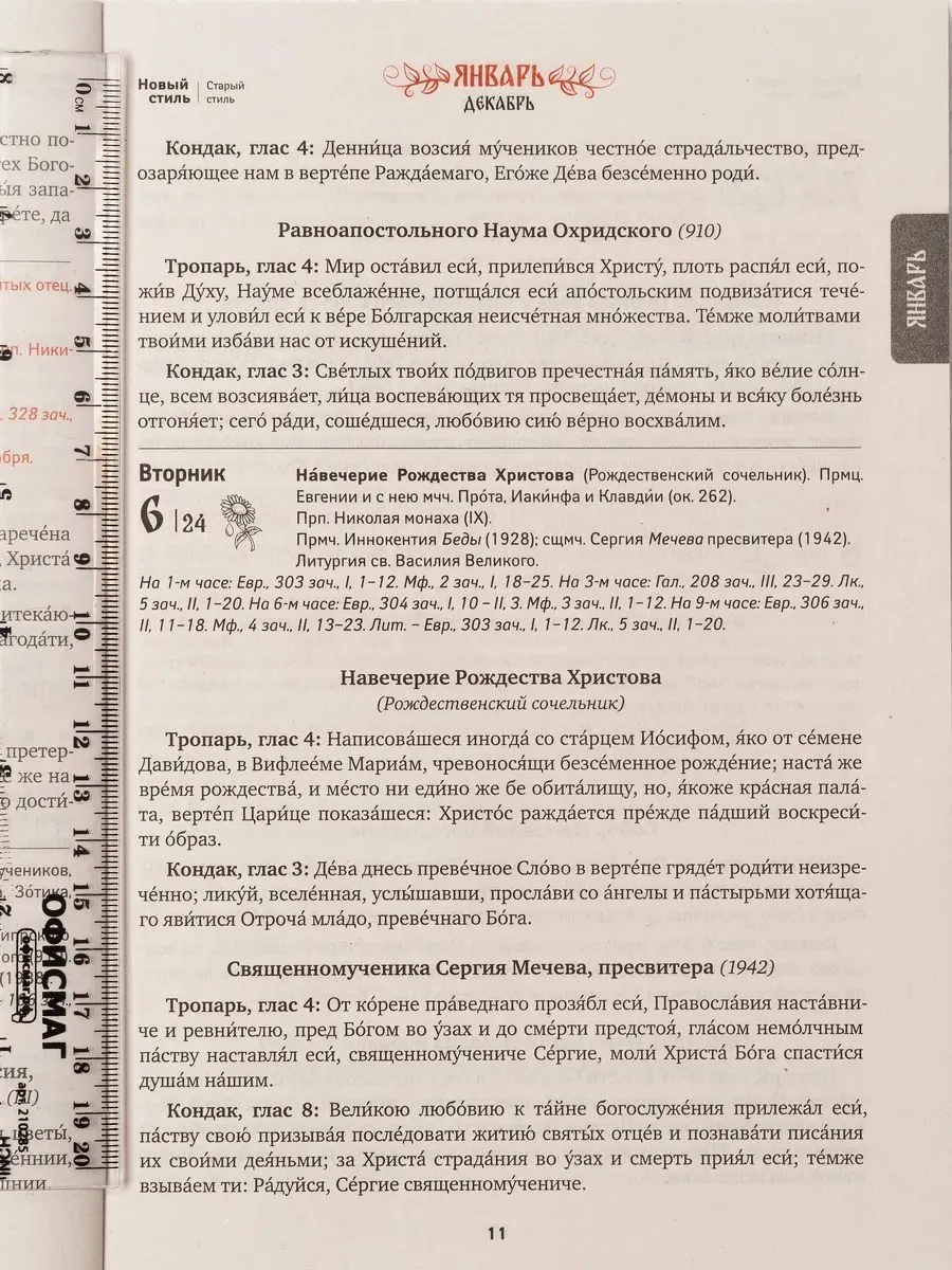 Takzhe v etom kalendare privodjatsja ukazatel chtenij iz Svjaschennogo Pisanija i teksty troparej i kondakov, posvjaschennykh Gospodskim i Bogorodichnym prazdnikam i izbrannym svjatym.V dannom kalndare shrift nabran v dva tsveta, s pomoschju ukazatelej mesjatsev mozhno bystro perejti na nuzhnyj fragment, a uslovnye oboznachenija legko orientirujut v pischevykh trebovanijakh na konkretnyj den.